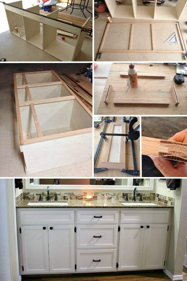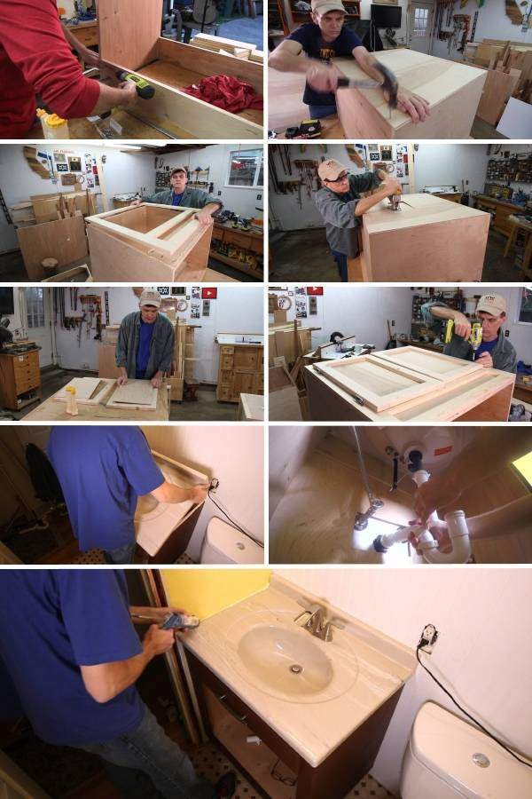 На следующих фото вам представлен процесс создания тумбы под раковину в ванную своими руками — для накладного и встраиваемого умывальников.