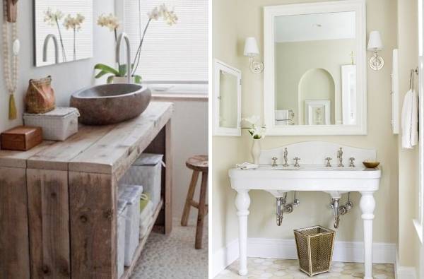 Так, встраиваемый умывальник для ванной монтируется под специальную столешницу, которая в результате будет немного нависать над тумбой. Как и для полувстраиваемых раковин, под него необходимо вырезать отверстие в крышке тумбы, ведь он будет располагаться внутри неё. На фото ниже вы можете сравнить эти виды раковин, установленные на тумбы в ванной своими руками.