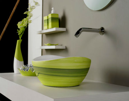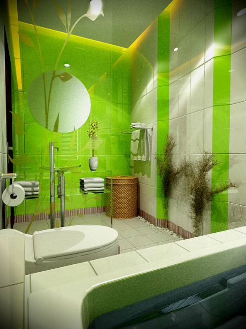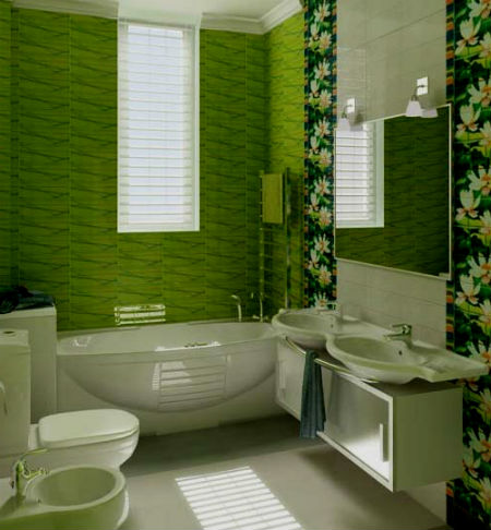 Зеленый цвет просто великолепно впишется в интерьер ванной комнаты, звук воды в дополнении с рассматриваемой палитрой, будет воздействовать на психику человека, наиболее расслабляюще и успокаивающе. Всего существует три основных варианта оформления ванной комнаты в зеленом цвете, а именно: светлые стены (бежевые, белые, серые) с зеленой мебелью; зеленые стены с белой мебелью; комбинированный вариант, когда зеленые и светлые цвета, встречаются как в отделке мебели, так и стен.
