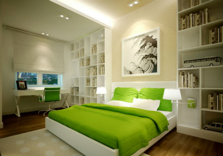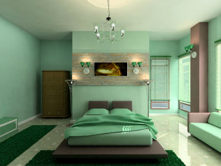 Как было замечено выше, неброский зеленый цвет обладает великолепными успокаивающими свойствами, который даже способен выступать в роли естественного снотворного, поэтому в интерьере спальни он будет наиболее уместен.