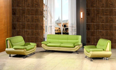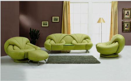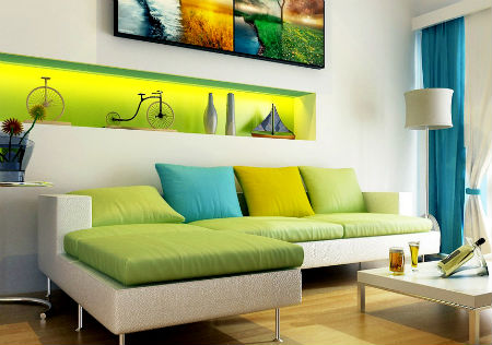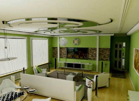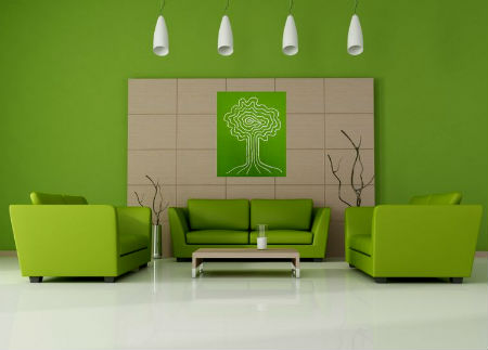 В интерьере гостиной комнаты, зеленый цвет лучше использовать в качестве акцентов, в противном случае он будет воздействовать излишне успокаивающе и даже клонить в сон, согласитесь при приеме гостей, данный факт абсолютно не уместен. Итак, какие же могут быть акценты? В зеленом цвете вполне можно приобрести мягкую мебель: диваны и кресла, но тогда стены, пол, потолок, должны быть более нейтральными. Помимо сочного оттенка мебели, следует приобрести зеленые шторы, напольные вазы, настенные панно, журнальный столик и напольный ковер.
