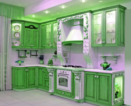Желающим похудеть, лучше использовать светло-зеленый цвет, он придаст помещению эффект прохлады, и оградит Вас от чрезмерного аппетита.
