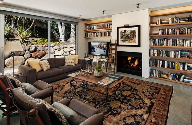 На территории дома уютно расположились следующие помещения: четыре спальных комнат, пять ванных, четыре из них примыкают к спальням, оставшаяся – отдельная, две гостиные, причем одна из них находится на свежем воздухе с открывающимся взору прекрасным видом на океан. Кроме того здесь есть уютная кухня, столовая и парочка подсобных помещений. Интерьер дома оформлен довольно просто, но смотрится очень уютно, комфортно и действительно обжито. Убедитесь в этом сами, изучив представленную ниже небольшую подборку фото.