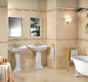 Традиционно для ванной комнаты стены и пол отделываются керамической плиткой – это обусловлено соответствием этого материала основным требованиям облицовки: влагостойкостью, прочностью, гигиеничностью, устойчивостью к бытовой химии и отличными декоративными показателями.