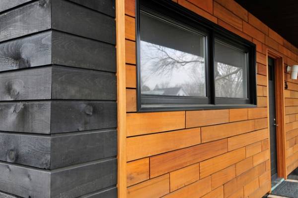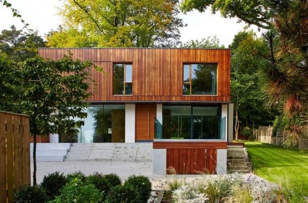 Отделка фасадов деревянными панелями обеспечивает хорошую изоляцию и считается экологичной. Древесина для этого типа облицовки, как правило, берется у дуба, кедра или сосны. С одной стороны такая отделка фасада частного дома является прочной и обладает хорошей устойчивостью к погодным условия, но с другой — она также требует большего ухода. Так, деревянные панели для фасада требуют ежегодной химической обработки, защищающей от термитов и других вредителей.