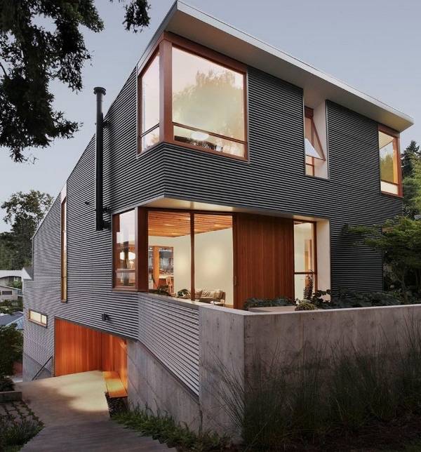 Самые практичные материалы для отделки фасадов частных домов включают в себя металлические панели для фасада, которые служат очень долго и не требуют никакого ухода, кроме периодической чистки. Блестящий фасад дома, отделанный металлическими панелями смотрится очень современно и привлекательно, особенно в сочетании с такими «теплыми» облицовочными материалами, как дерево и камень. Как правило, для изготовления этих панелей используется алюминий или сталь. Как вам нравится такая отделка фасадов?