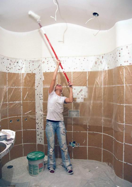 Покраска потолка в ванной – наиболее дешевое, практичное и легко воплощаемое решение