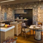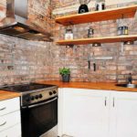 Отделка стен на кухне декоративным камнем — натуральным или искусственным — требует определенной сноровки. Предварительно также требуется выровнять поверхность перед тем, как начинать отделочные работы. Кладут на клей для плитки, сначала покрыв грунтовкой. После укладки камня расшиваются швы (раствором или затиркой), после стена покрывается лаком — чтобы проще было ухаживать.