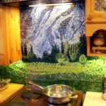 Хорошо смотрится отделка стен на кухне мозаикой. Это очень мелкая керамическая, стеклокерамическая или стеклянная плитка, наклеенная на сетку — для более быстрого монтажа. Маленькие квадратики могут быть одного цвета, а могут — разных оттенков в одной гамме, есть мозаика, выложенная узорами и даже картинами. Этот вид отделочного материала еще дороже чем керамическая плитка, но и вид у него нестандартный.