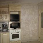 Декоративная штукатурка для отделки стен в кухне хороший выбор — она моется, длительное время сохраняет свой вид, многие пигменты не блекнут и не выгорают. Недостаток — высокая цена на материал и сложная техника нанесения, с которой справляются далеко не все «мастера». Кроме умения штукатурить тут требуется художественный вкус, а он есть далеко не у всех.