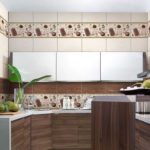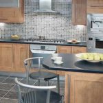 Но, не смотря на наличие новых материалов, плитка — все еще наиболее популярный вариант для отделки рабочей стены на кухне. Только в стилистике оформления появились существенные отличия. Повсеместно используемая ранее средних размеров квадратная плитка 15*15 см или 18*18 см уже не популярна. В фаворе большие форматы — длинная прямоугольная или квадратная, но со стороной не менее 35 см, а то и 50-70 см. Так и получается, что на кухонный фартук требуется один-два ряда плитки.
