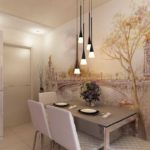 Еще один отдельный вид обоев — фотообои. Яркие или пасторальные пейзажи, городские снимки, кухонные «натюрморты» — все что душе угодно. Наклеивается обычно на стену, у которой стоит стол или на свободную стену. Есть, кстати способ размыть границы в прямоугольной кухне — наклеить широкоформатное изображение с заходом на соседнюю стену. Сразу меняется визуальное восприятие помещения.