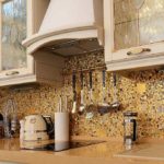 Отделать мозаикой в кухне можно не только рабочую стену. Такое же панно делают над обеденным столом. Это гармонизирует интерьер. К тому же, еще одна часто пачкающаяся зона получает легко моющееся покрытие.