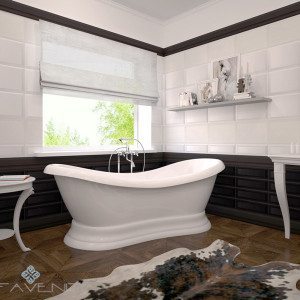 Дополнительная “оправа“ для ванны не понадобится, так как ванна отдельно стоящая, а точнее, наружные ее стенки достаточно эстетично оформлены. Можно разместить такую ванну где угодно – в углу, вдоль стены и даже в центре ванной комнаты, а для подведения коммуникаций соорудить подиум, чтобы создать подобие королевского трона.