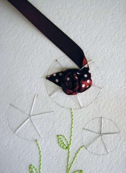 между натянутыми ниточками-радиусами тесьмой или лентой формируем шапку цветка (смотрим фото);