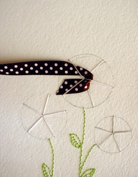 от центра цветков протягиваем пять радиусов с помощью нитки и иголки (смотрим как на фото);