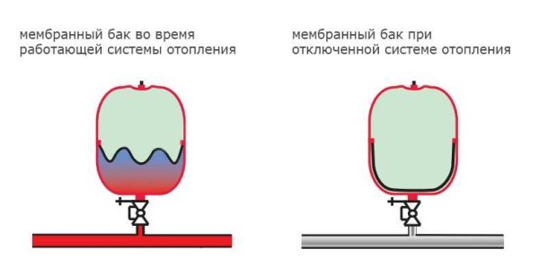 Расширительный бак для предназначен для компенсации изменения объема теплоносителя в зависимости от температуры. В закрытых системах отопления это герметичная емкость, разделенная эластичной мембраной на две части. В верхней части находится воздух или инертный газ (в дорогих моделях). Пока температура теплоносителя невысока, бачок остается пустым, мембрана расправлена (на рисунке картинка справа).