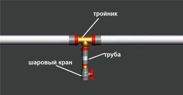 В самой нижней точке системы, как правило, на обратном трубопроводе, для запитки/слива системы устанавливают дополнительный кран. В простейшем случае это тройник, установленный в трубопроводе, к которому через небольшой участок трубы присоединен шаровый кран.