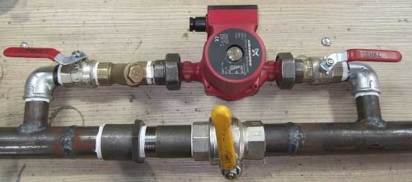 В системах, которые могут работать и с естественной циркуляцией, при установке необходимо предусмотреть возможность снять или заменить насос без необходимости слива теплоносителя, а также для возможности работы без насоса. Для этого устанавливается байпас — обходной путь, по которому может протекать теплоноситель при необходимости. Схема установки циркуляционного насоса в таком случае на фото ниже.