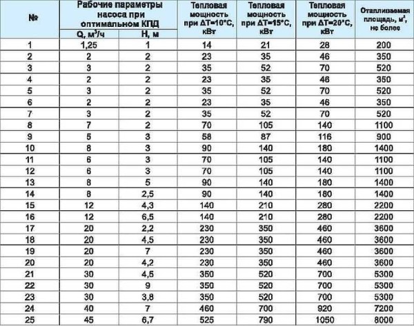 Циркуляционный насос обеспечивает работоспособность закрытой системы отопления. Его мощность зависит от многих факторов: материала и диаметра труб, количества и типа радиаторов, наличия запорной и терморегулирующей арматуры, протяженности труб, режима работы оборудования и т.д. Чтобы не вдаваться в тонкости расчета мощности, циркуляционный насос можно выбрать по таблице. Выбираете ближайшее большее значение по отапливаемой площади или планируемой тепловой мощности системы, в соответствующей строке в первых колонках находите требуемые характеристики.