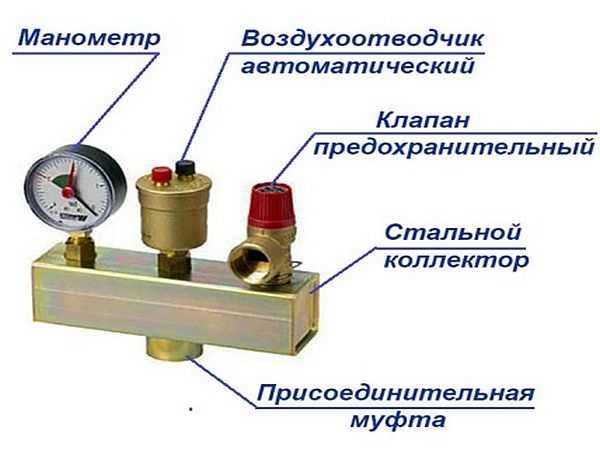 Ставится группа безопасности на подающий трубопровод на выходе из котла. Она должна контролировать его работу и параметры системы. Состоит из манометра, автоматического воздухоотводчика и предохранительного клапана.