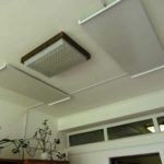 Этот вид ИК обогревателей располагается исключительно на потолке. Нагревательный элемент — трубки, излучающие волны в требуемом диапазоне. Излучение рассеивается при помощи металлических рассекателей, тем не менее, поток волн остается все-таки мощным, нагрев поверхности сильным. В связи с этим устанавливать потолочные инфракрасные обогреватели рекомендовано не ниже чем на высоте в 3,2 метра, но более комфортные ощущения если они находятся на высоте около 3,6 метра.