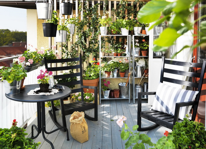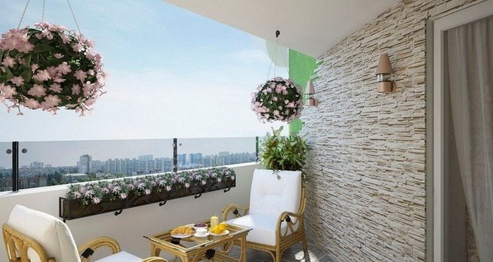 • Живые цветы. Самое удачное украшение для любого балкона. Делая ремонт, прибейте несколько дополнительных полок для горшков. Можно посадить цветы в разноцветные горшки разных форм и размеров. Такая цветущая клумба украсит любой балкон, превратит его в небольшой личный палисадник. Для дополнительного декорирования можно использовать различные материалы, которые разнятся по фактуре, создав оригинальный дизайн.