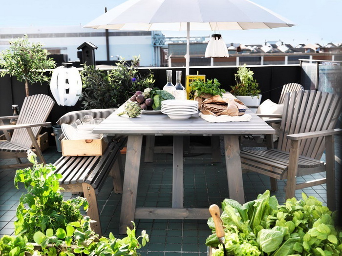 • Мебель. Должна быть легкой и раскладной. Сегодня производители предлагают мебель из материалов, которые не бояться дождя, пыли и сырости – бамбук, пластик, полированное дерево. Важно, чтобы мебель подходила по стилистике к Вашему балкону и не была слишком громоздкой. В качестве идеи с экономией пространства, можно использовать раскладную или откидную мебель. В качестве декора подойдут свечки, красивые абажуры, садовые фонарики, живые цветы в горшках. Отличным вариантом будет мебель-трансформер.