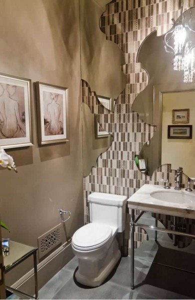 Горизонтальное деление дает еще один эффект: четкая грань как-бы «разваливает» стены в стороны опуская потолок. В узком и высоком помещении это нужный эффект. Если подобный дизайн туалета — с четким делением — вам совсем не нравится, сделайте что-то похожее, видоизменив идею. Например, как на фото ниже.