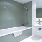 Если окрашенные стены в ванной закрыть стеклянными панелями, сносу такой отделке не будет
