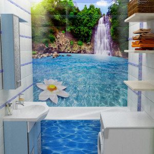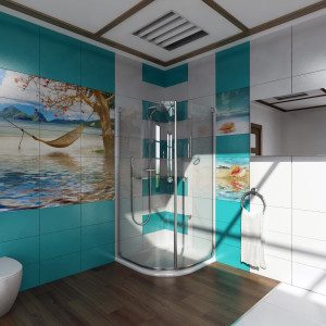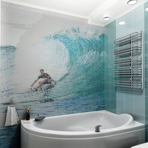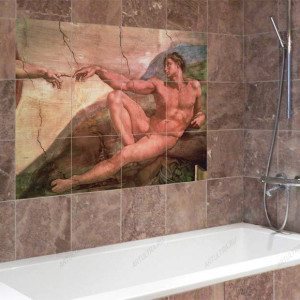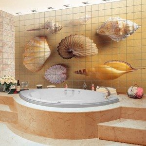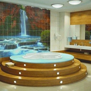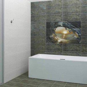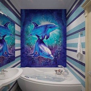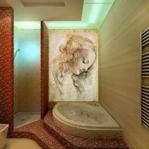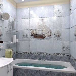 • В случае достаточно просторного помещения можно выбрать такой вариант, как керамическая плитка-панно для ванной с разнообразными сюжетами, или объемное панно, которое также смотрится довольно привлекательно. Панно при этом может быть полностью или частично выполнено в форме барельефа;