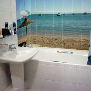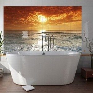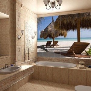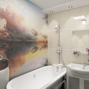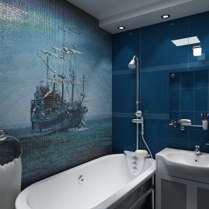 • В случае более маленького помещения можно выбрать панно-перспективу или панно-панораму. Отлично подойдут такие изображения, как море, небо, природы и т.д. Плитка-панно для ванной с подобными изображениями позволяет визуально «раздвинуть» границы помещения маленькой площади.