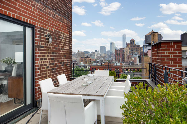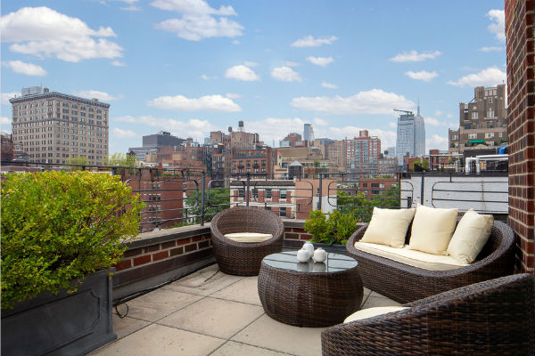 Вид с террасы действительно впечатляющий, присмотревшись можно увидеть Empire State и  One World Trade.  На террасе есть обеденная зона со столом и удобными стульями-креслами, а также зона отдыха с плетеной мебелью.