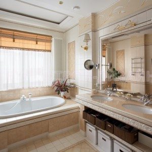 • Колонны великолепно украсят большую ванную. Пол здесь пусть будет немного ниже, чем во всей квартире на случай аварии, а порог – выше. Планировка ванной предполагает и наличие аварийного слива для воды. Датчики, обогревающий кабель укладывают только под ноги, а не под сантехнику и мебель. В просторной комнате можно сделать подиум для ванны, бордюры. Пол с подсветкой наиболее эффектен.