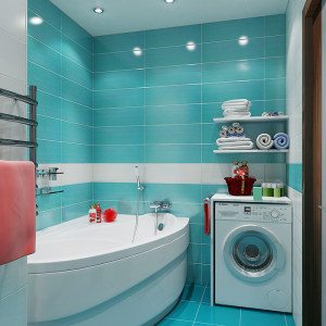 • В маленькую комнату лучше поставить угловую ванну и угловую раковину. Экономит пространство и размещение подвесной раковины над ванной.  Под раковиной–кувшинкой можно поставить стиральную машину – у нее слив сбоку.