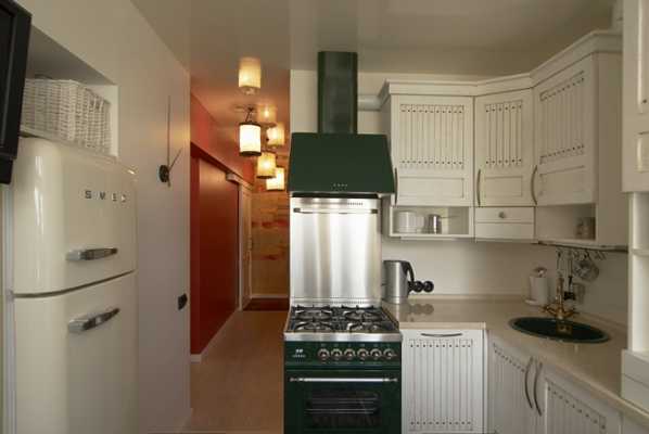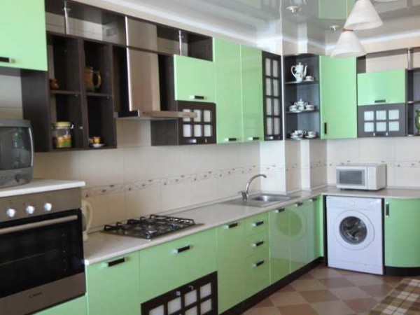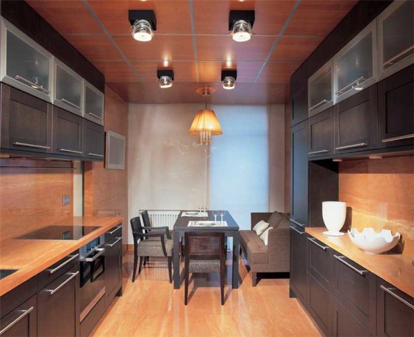 Этот способ планировки подходит для длинной и узкой кухни с окном в короткой стене. Чтобы не перекрывать доступ к окну, оставить открытой батарею, шкафы и технику расставляют вдоль двух стен. Так же вынуждены поступать и если помещение проходное.