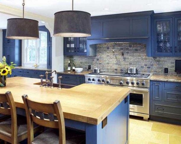 Классическая мебель в неклассическом цвете. На этом фото планировка кухни островная, но данную идею несложно трансформировать: попытаться обыграть традиционную мебель каким-то необычным цветом.