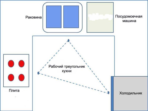 При планировании учтите, что желательно чтобы плита, мойка и холодильник составляли треугольник. Ученые проанализировали перемещение хозяек по кухне и выяснили что большую часть времени она проводит возле мойки, возле плиты и холодильника — немного меньше. Но перемещается в основном между этими тремя объектами.