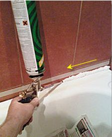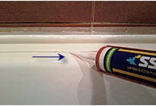 Герметиком заполняют все стыки между ванной и бордюрами, не забывая заполнить и угловой стык между бордюрами.
