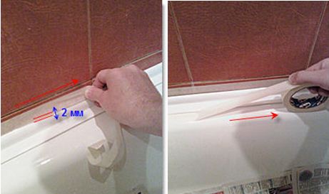 Внизу также приклеивают скотч на расстоянии 2 мм от бордюра. Во избежание загрязнения ванны в нее укладывают газеты.