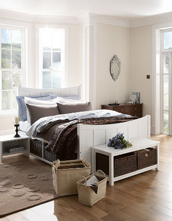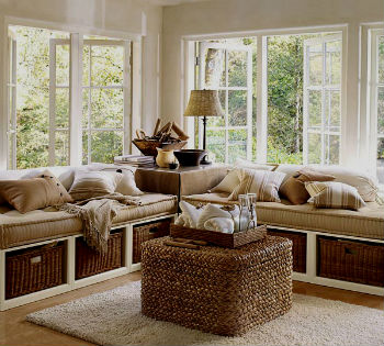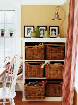 В данном помещении корзины можно хранить под кроватью, возле туалетного столика, на туалетном столике, на подоконнике и открытых полочках шкафа. При таком раскладе, экономие пространства «на лицо», Вы только представьте, сколько различных вещей можно аккуратно сложить в среднего размера корзинки… В них можно хранить: журналы, книги, фотоальбомы, милые безделушки, предметы для рукоделия, постельное белье, косметику, праздничные украшения, сумки, подушки, полотенца и так далее.