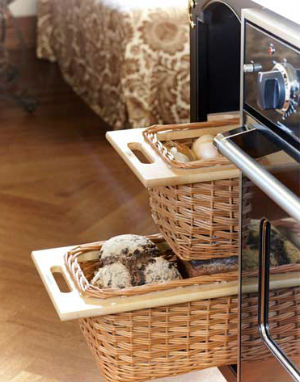 В невысоких корзинках с открытым верхом можно хранить различные столовые приборы, в изделиях с высокими бортиками, вполне можно хранить картофель и прочие овощи. Столовые корзины (бывают круглыми или овальными) предназначены для фруктов. На самом деле плетеные изделия можно приспособить практически для любых продуктов: хлеба, круп, пачек сахара или соли, бутылок. Кроме того в них прекрасно можно вместить различные моющие средства, скатерти, салфетки, губки для мытья посуды и так далее.