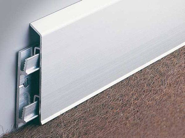 Напольные алюминиевые плинтуса отличаются формой. Они больше похожи на прямоугольник в сечении, у них нет силиконовых бортиков. Зато есть обилие размеров, форм и способов монтажа.