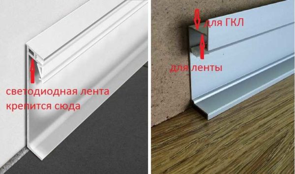 В алюминиевом плинтусе со светодиодной подсветкой с лицевой стороны сформована канавка, в которую укладывается светодиодная лента. Закрывается канавка полосой прозрачного или матового пластика. Соответственно, свет получается более яркий или рассеянный. Такие плинтуса дают интересный эффект — стены «парят» в воздухе. Если их установить в коридоре, в ночное время нет необходимости в дополнительном освещении.