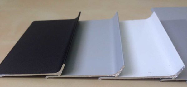 Не стоит думать, что алюминиевый плинтус может быть только серебристо-серого цвета. В процессе анодирования он может быть покрашен в любой цвет, но чаще всего можно найти черный, белый, бронзу, латунь и несколько оттенков серого цвета.