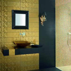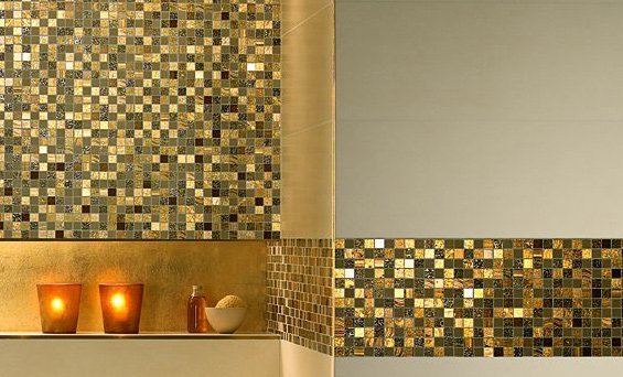 - Авангардной сейчас считается плитка со вставками из цветного металла, природных материалов, особенно стекла, или их экономичная, но искусная подделка.
