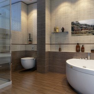 - Для комнаты с джакузи лучше использовать модную плитку с имитацией экологичных текстур: текстиль, камень, дерево.