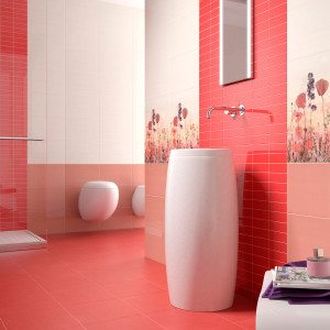 - Плитку можно использовать локально и облицевать только часть стены, определенную ее зону: над раковиной, у зеркала, или сделать красным пол.