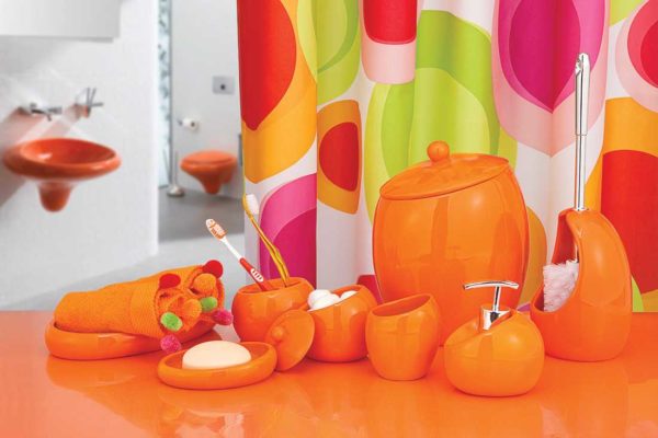 Есть более дорогие пластиковые наборы для ванных, которые уже и смотрятся интересно. Их плюс в том, что есть очень яркие и симпатичные изделия, которые могут порадовать как формой, так и цветом. Минус — чтобы пластик хорошо выглядел за ним нужен соответственный уход. А из-за особенностей материала полки делают или вообще сплошными с несколькими отверстиями или из толстых планок, на которых скапливаются мыльные отложения, соль, грязь. В общем, отмывать пластиковые аксессуары для ванной комнаты — не самое быстрое и приятное занятие.