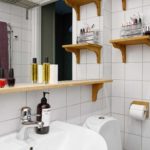 Казалось бы, дерево — не самый удачный материал для высокой влажности ванных комнат, но и из него делают аксессуары. Причем на контрасте с кафелем смотрятся такие изделия очень и очень неплохо. Хорошая новость в том, что полочки в ванную из древесины можно сделать своими руками даже при не очень большом опыте в столярном мастерстве. Именно «простые» по стилю модели и дают интересный эффект. А для того чтобы повышенная влажность не вредила древесине, есть лаки, пропитки на основе масла, краски. Причем краски используются нечасто — смысл деревянных аксессуаров для ванной комнаты как раз в том, чтобы сохранить и подчеркнуть естественную фактуру и цвет. Именно такое сочетание с кафелем (особенно светлых тонов) более привлекательно.
